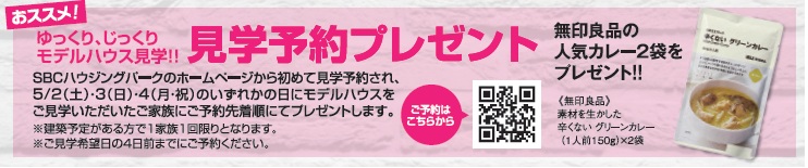 SBCハウジングパークのHPから初めて事前に見学予約をされて、イベント期間中にモデルハウスをご見学を頂いたご家族にご予約先着順にて無印良品の人気カレー2袋をプレゼント‼