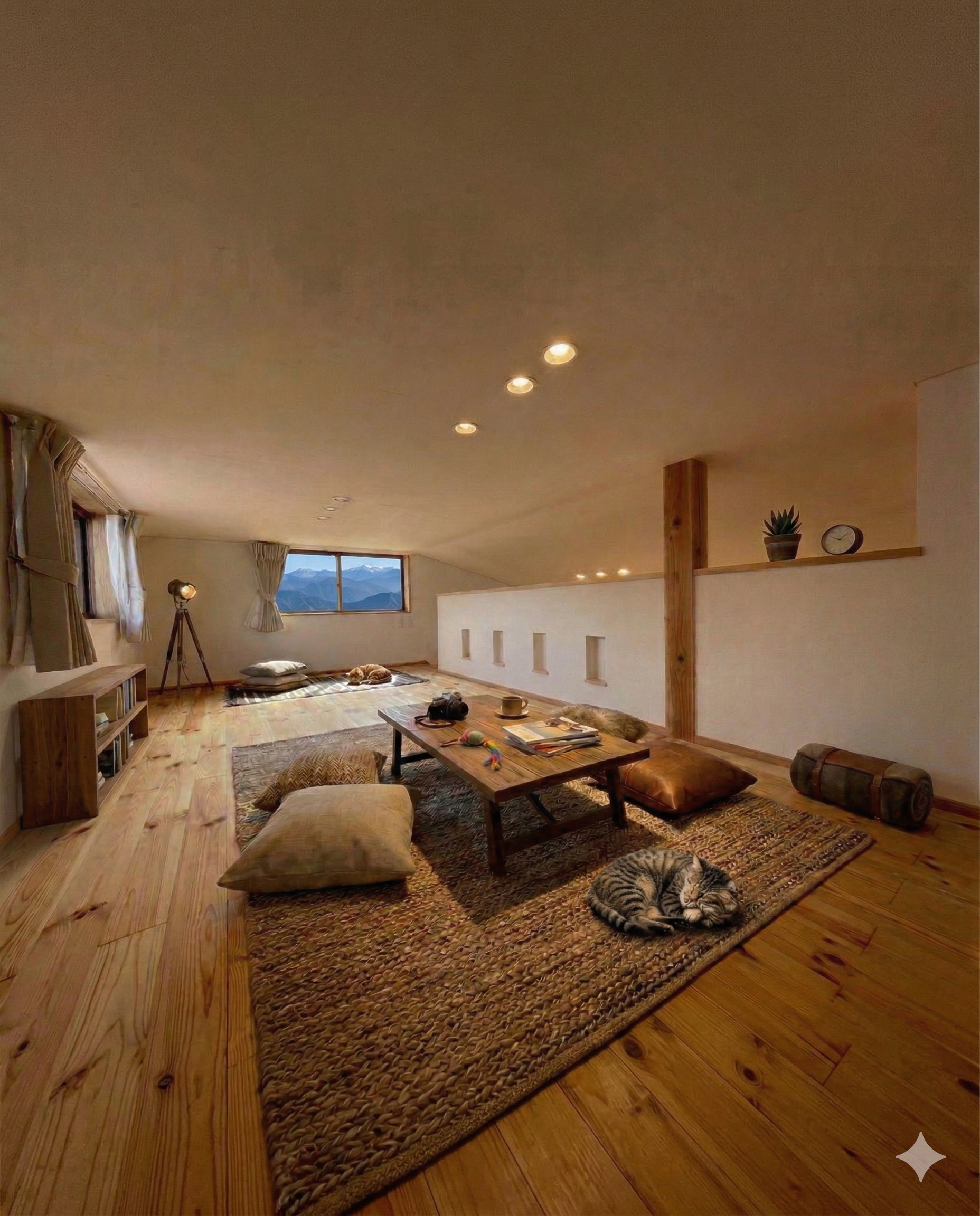 北信五岳の美しい山並みが広がる10畳のロフトは、愛猫と景色を堪能する贅沢な空間。