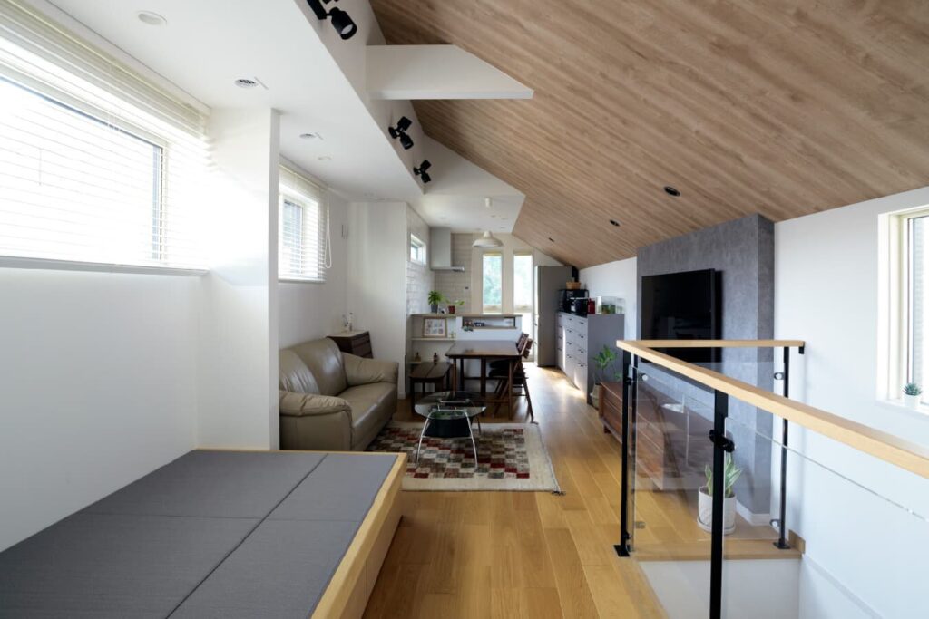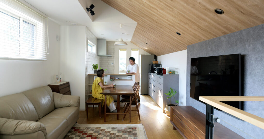 2階のLDKは、最大3.3mの天井高の勾配天井が広がる、のびやかで気持ちのいい空間。天井の木調がくつろぎ感を高めています。