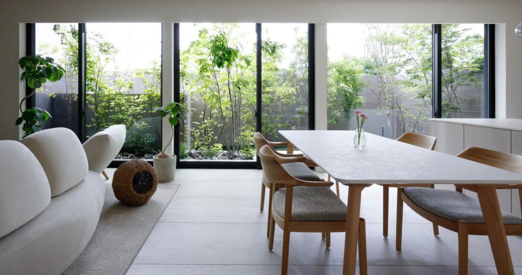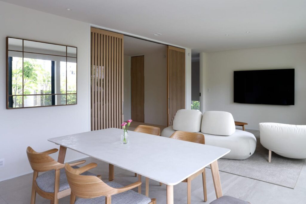 インテリアは、シンプルでいてぬくもりのあるジャパンディスタイル。庭の緑が映えるよう、さわやかなアイボリー系で色味を統一し、余白のあるノイズレスな空間に仕上げています。