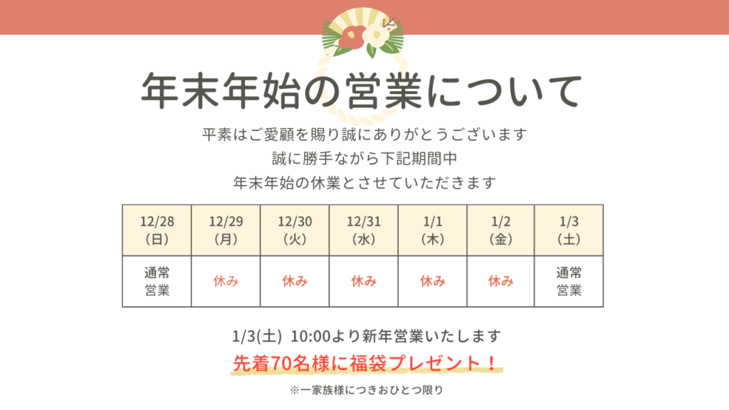 【休業期間】 2025年12月29日(月)〜 2026年1月2日(金)