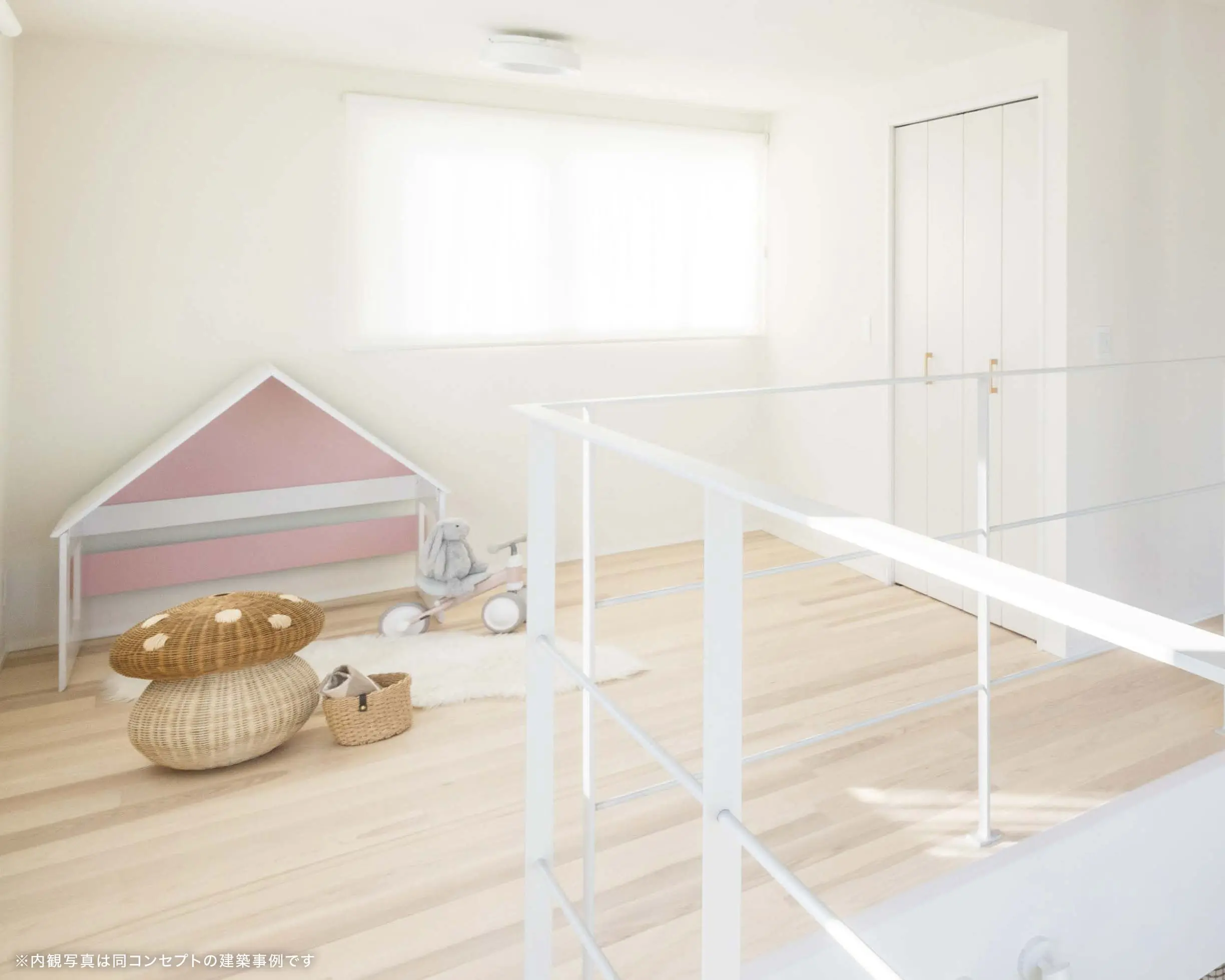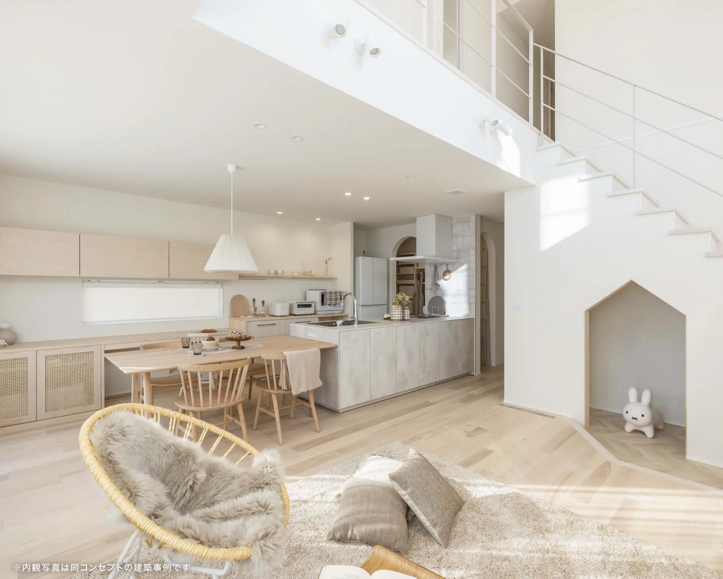 吹き抜けからの光と、2階ホールで遊ぶ子どもたちの声が心地よく届くLDK、見通しの良いキッチン。ホールは将来、壁を設け二つの子ども部屋としても利用可能な設計に。あえて扉をなくした吹き抜け上部の書斎は、家族の気配を感じながら集中できる、ほどよいおこもり空間です。