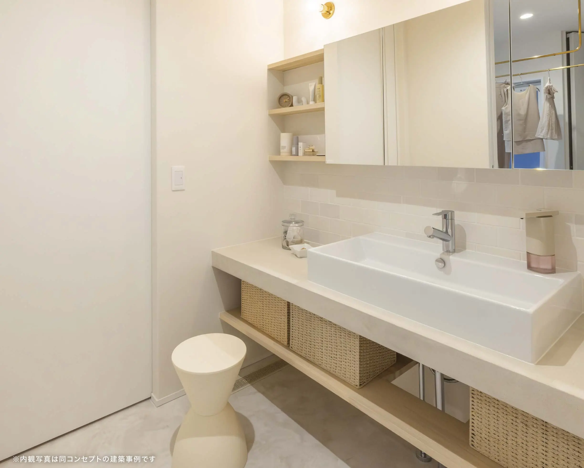 洗濯脱衣室からWIC、キッチンへとぐるりと回遊できる水廻り動線で、「乾かす・畳む・仕舞う」がスムーズに完結。隣接するアイランド型キッチンは左右に遮るものがなく、家族みんなが行き来しやすい設計。自然と家事を分担でき、子どもの自主性を育める知育キッチンです。